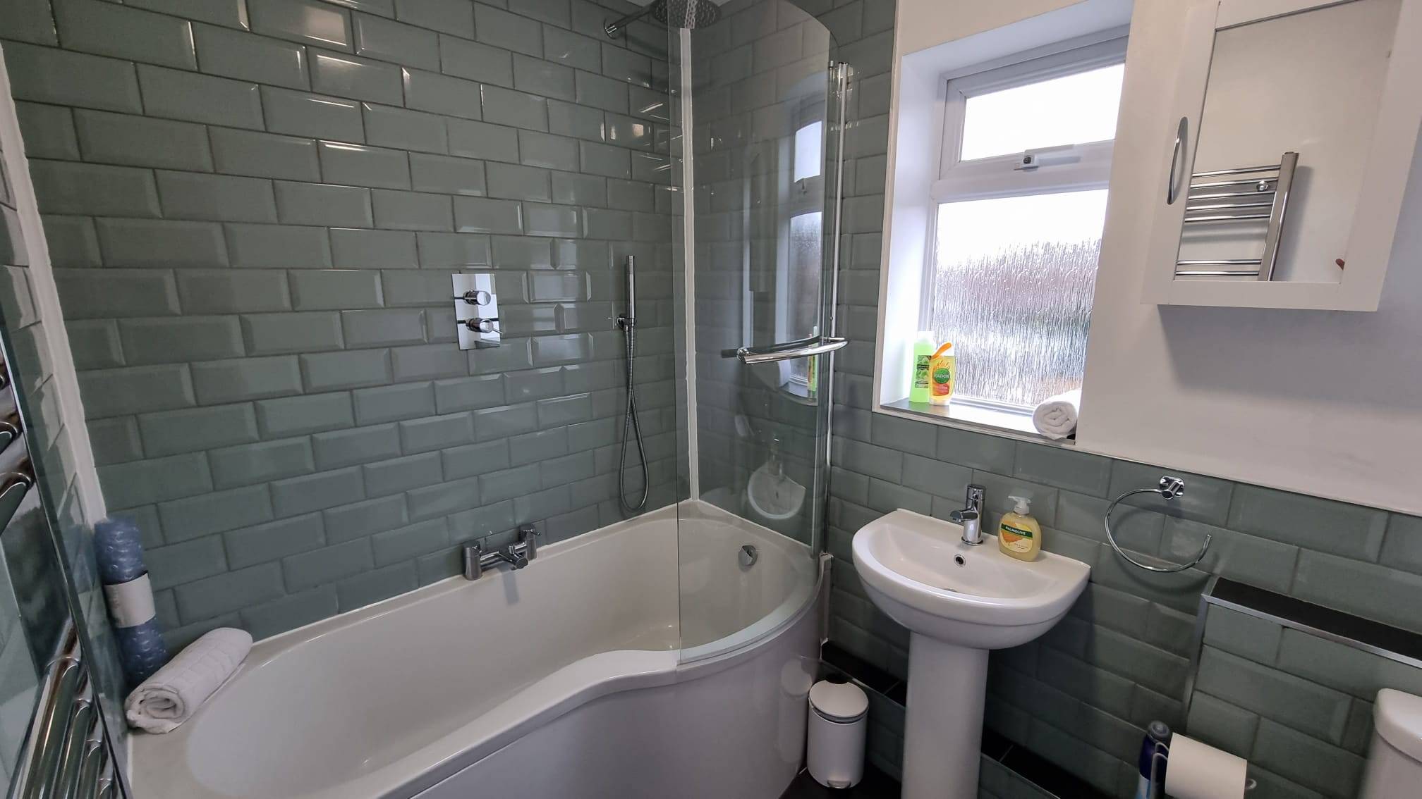 - Family sized bathroom with over bath shower